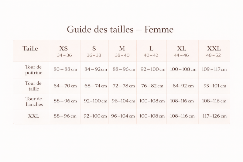 Notre guide des tailles femme a été conçu pour vous aider à choisir des pièces adaptées à votre silhouette et à votre style. En prenant le temps de consulter les mesures et les conseils indiqués, vous mettez toutes les chances de votre côté pour trouver la taille qui vous correspond vraiment.